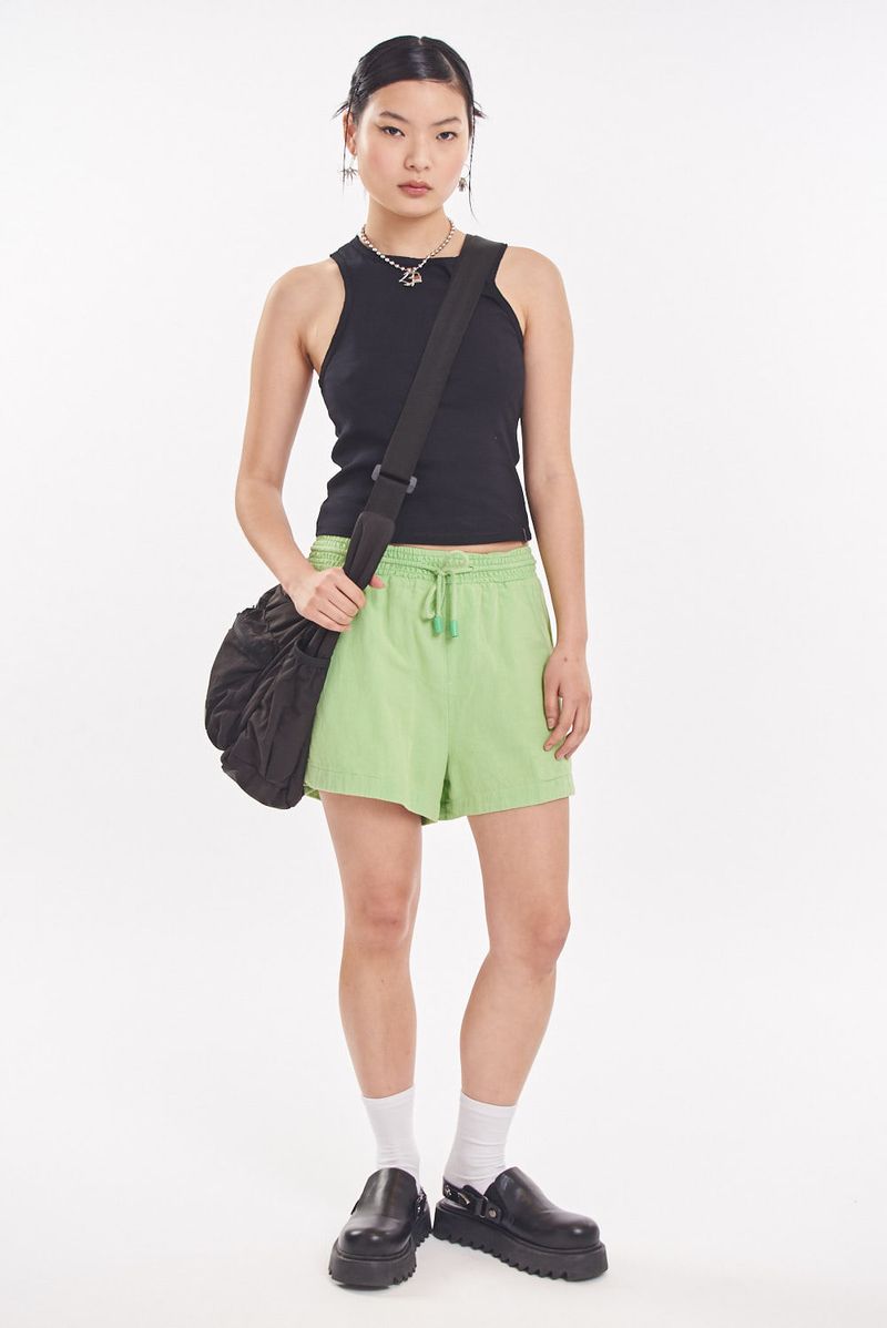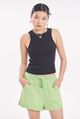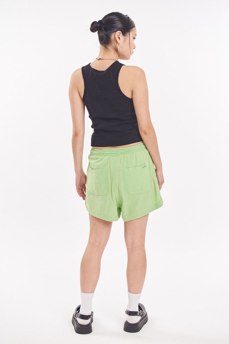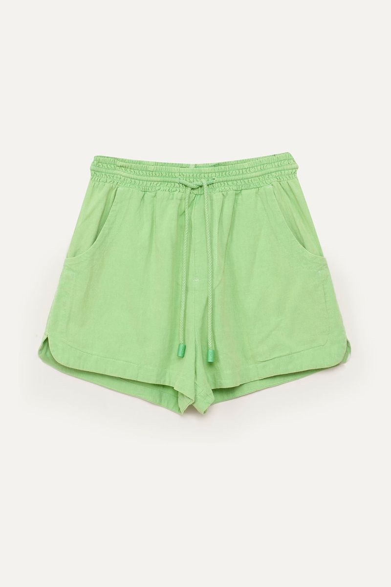 Short en lino con efecto lavado. Cintura con elastico interno y cordon de ajuste. Bolsillos delanteros y traseros.