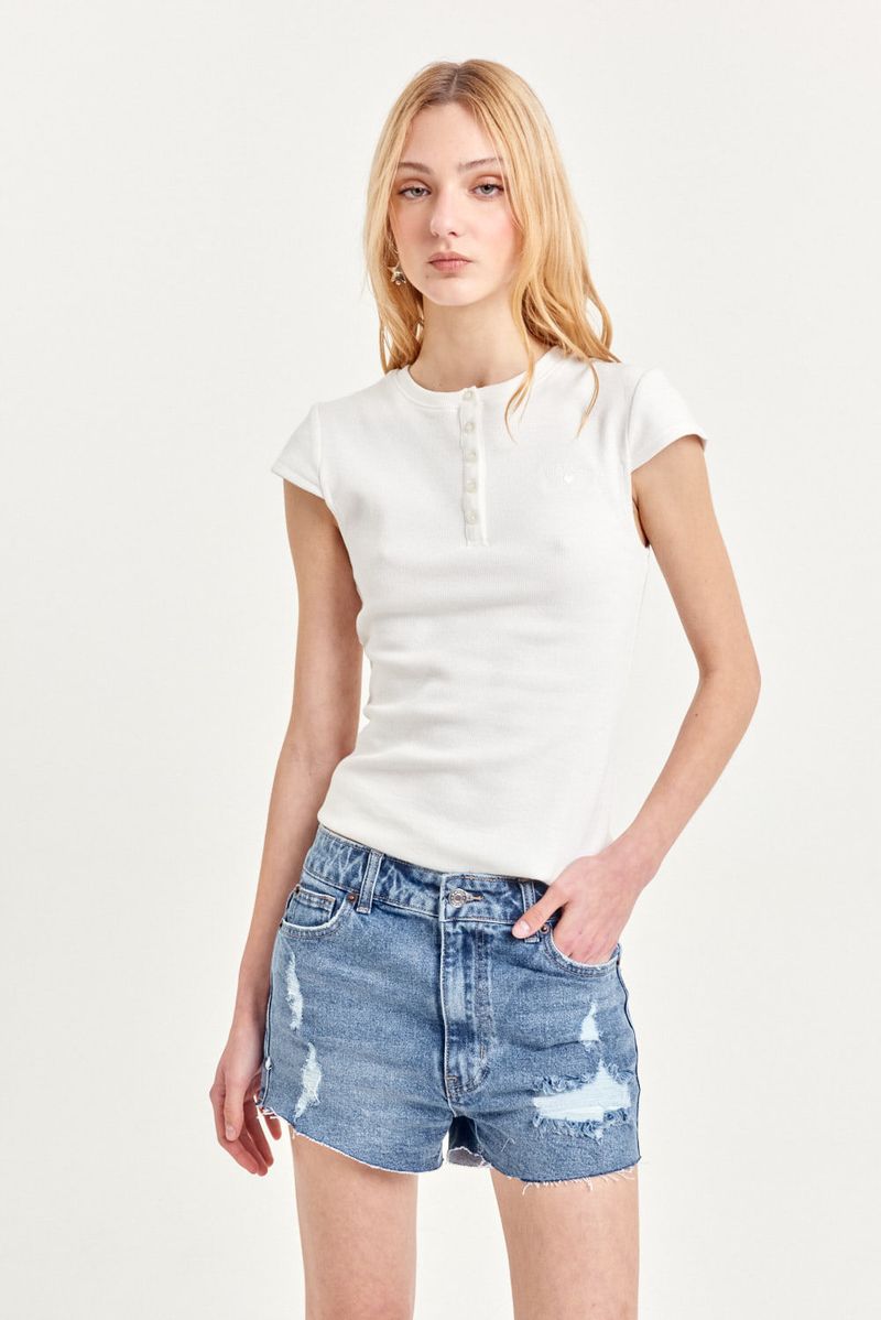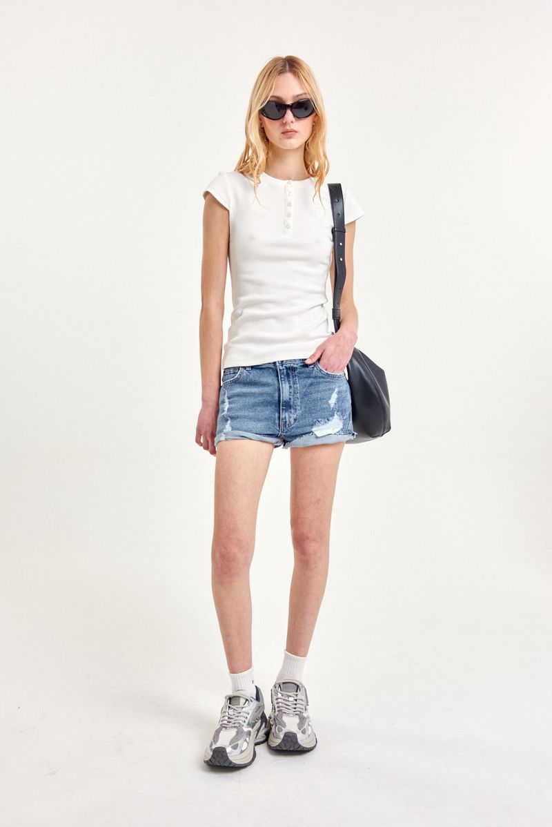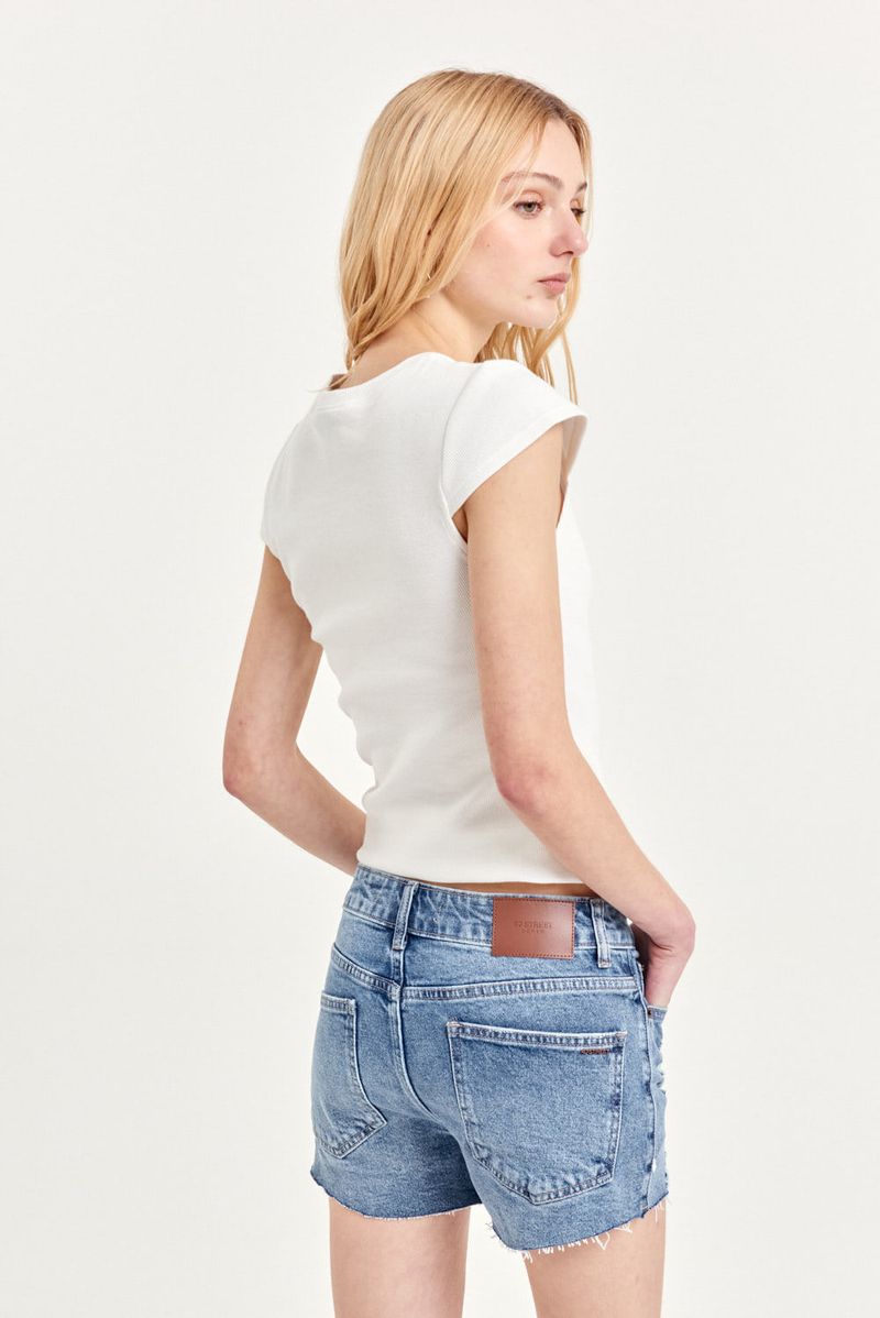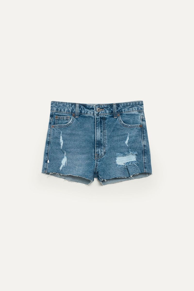 Short de denim elastizado con cinco bolsillos, calce confort, tiro alto y pierna ajustada. Presenta roturas delanteras y ruedo al corte con lavado azul gastado. Botones y remaches color níquel. Cada prenda es única ya que atraviesa un proceso artesanal. Ideal para combinar con blazers oversized o camisas cropped.