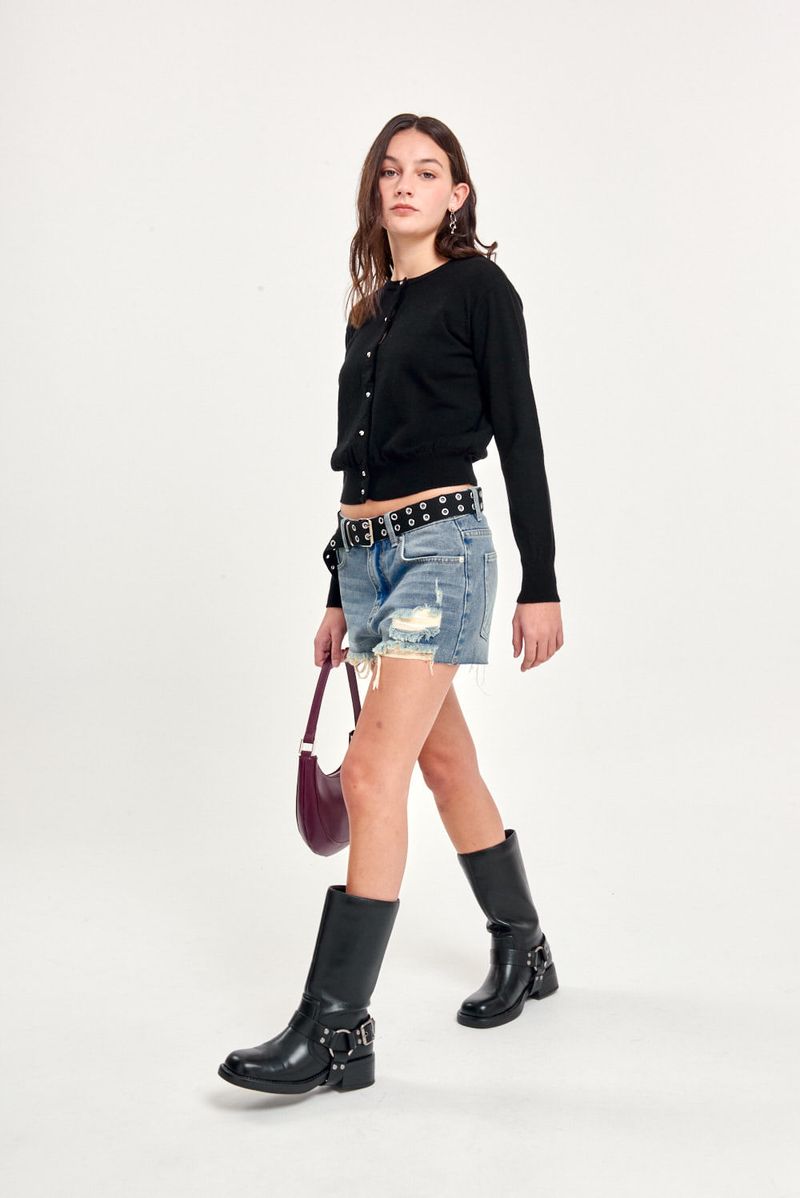 Short de denim rígido con cinco bolsillos, tiro medio y ruedo al corte. Presenta un lavado azul claro con leves desgastes y roturas, lo que le da un aspecto artesanal y único en cada prenda. De calce relajado y cómodo, ideal para usar con remeras básicas o tops.