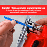 Equipada con sistema de cambio rápido de hojas, permite ahorrar tiempo y trabajar con mayor comodidad. Su capacidad de corte llega a 55 mm en madera, 6 mm en acero y 18 mm en aluminio, siendo una herramienta versátil para proyectos de carpintería, bricolaje y reparaciones.