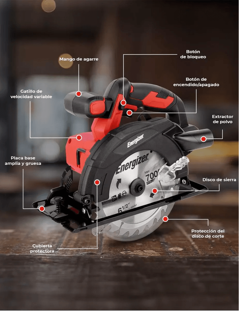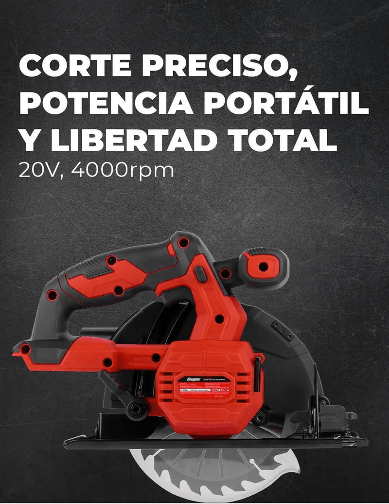 La sierra circular inalámbrica Energizer 20V de 6-1/2” con motor brushless ofrece potencia, precisión y durabilidad en cada corte. Su diseño sin cable brinda libertad total de movimiento para trabajar en madera, MDF, tableros y más, alcanzando hasta 4000 rpm para cortes rectos y biselados limpios.