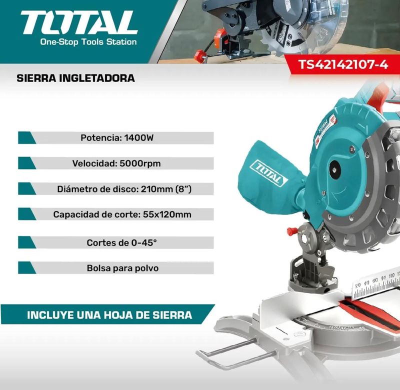 La Sierra Ingletadora Total de 1400 Watts es una herramienta esencial para cualquier aficionado o profesional del bricolaje. Con una impresionante velocidad de 5000 rpm, esta sierra garantiza cortes precisos y eficientes. Su disco de 210 mm (8 pulgadas) es ideal para una variedad de materiales, y viene equipada con una hoja de corte para madera, lo que la convierte en una opción versátil. La base de aluminio proporciona estabilidad y durabilidad, mientras que la bolsa para polvo ayuda a mantener su área de trabajo limpia. Este modelo, TS42142107-4, cuenta con un diseño robusto y calidad industrial, asegurando un rendimiento excepcional. Aunque no es inalámbrica ni telescópica, su potencia de 1400 W y su capacidad de inclinación de 45 grados la hacen perfecta para cortes en ángulo. Además, incluye un manual en inglés para facilitar su uso. ¡Transforma tus proyectos con esta herramienta de alta calidad!