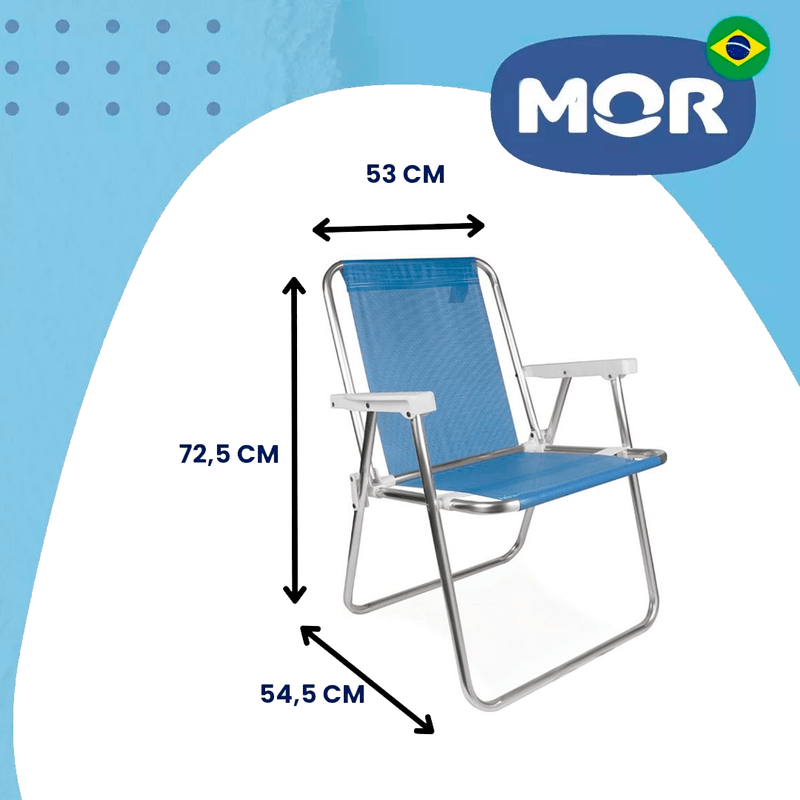 Plegable y fácil de transportar, ideal para llevar a la playa, ya que el aluminio garantiza una mayor durabilidad, incluso en las regiones costeras. Debido a que es más liviano que otros materiales, también es ideal para pescar o acampar. Además de todo, es cómodo, perfecto para acompañarte a última hora de la tarde con amigos en el balcón o jardín de tu casa. Muy resistente, tiene una estructura fabricada por Mor en aluminio de excelente calidad y partes plásticas en polipropileno, soportando hasta 110 Kg. Su lona está hecha de poliéster 100%.