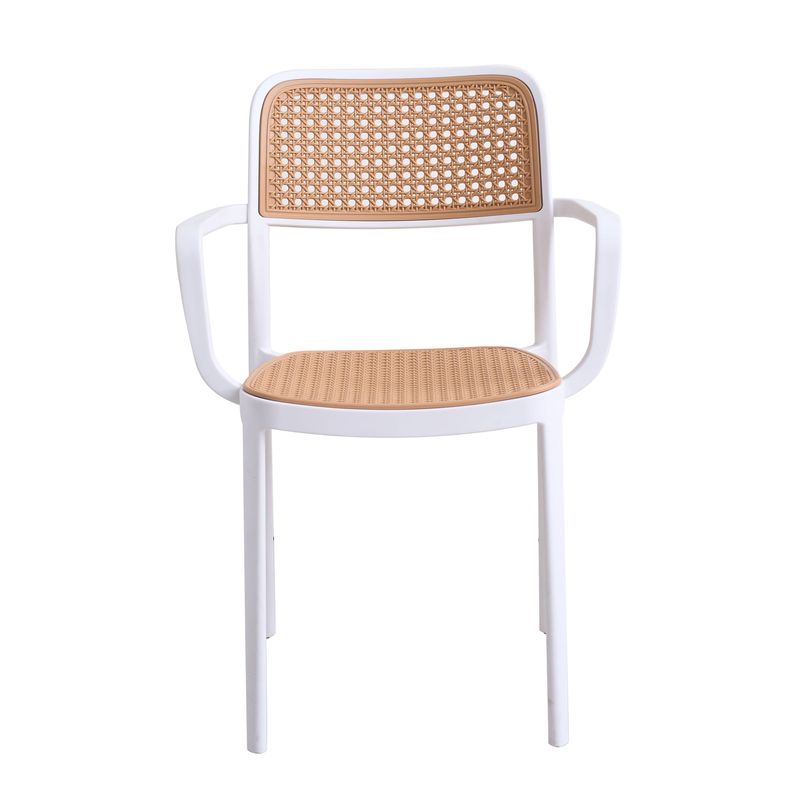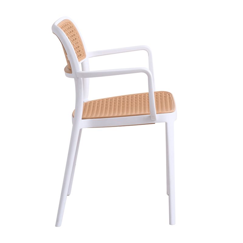 La Silla De Comedor Tina de PVC con apoya brazos y diseño de rejilla plástica ofrece una combinación ideal de estilo, resistencia y funcionalidad. Fabricada íntegramente en polipropileno inyectado, es liviana, apilable y muy fácil de limpiar. Su asiento y respaldo cuentan con una textura de rejilla que no solo aporta un look moderno y aireado, sino que también mejora la ventilación al sentarse. Perfecta para uso interior o semicubierto en comedores, patios, bares o cafeterías, esta silla es una solución práctica y duradera para espacios que requieren mobiliario versátil y resistente al uso intensivo.