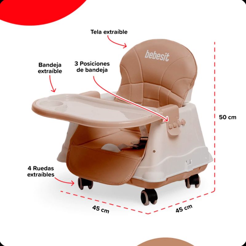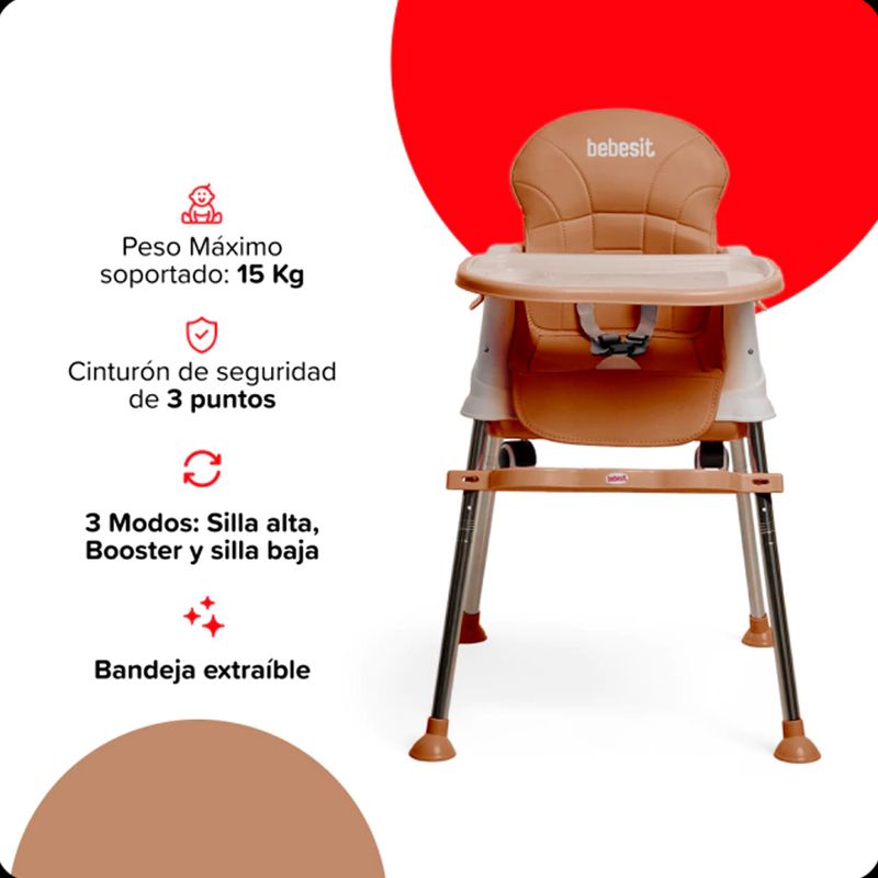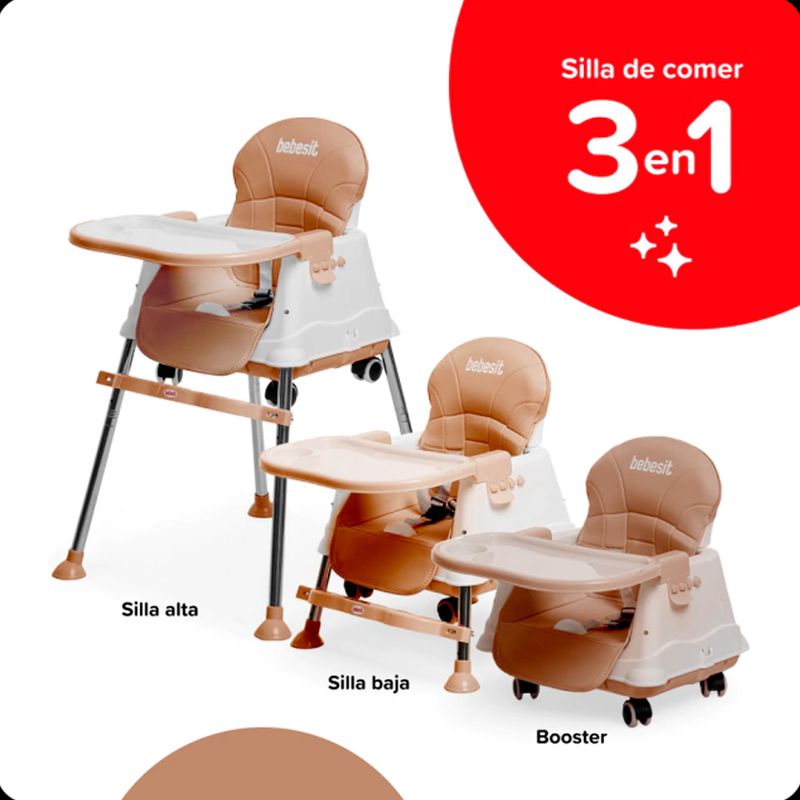 La silla para comer Bebesit combina tres funciones en un solo producto, adaptándose al crecimiento del bebé. Con un diseño moderno, materiales seguros y detalles prácticos, es ideal para usar como silla alta, booster o silla baja en cada etapa.
