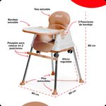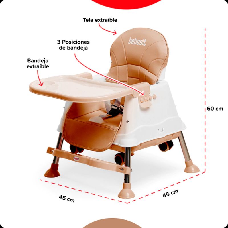 Con una estructura plástica y metálica de alta resistencia, asiento acolchado con funda removible para fácil limpieza con un paño húmedo, esta silla incluye una bandeja doble, cinturón de seguridad, correas de sujeción, ruedas con freno y patas desmontables.