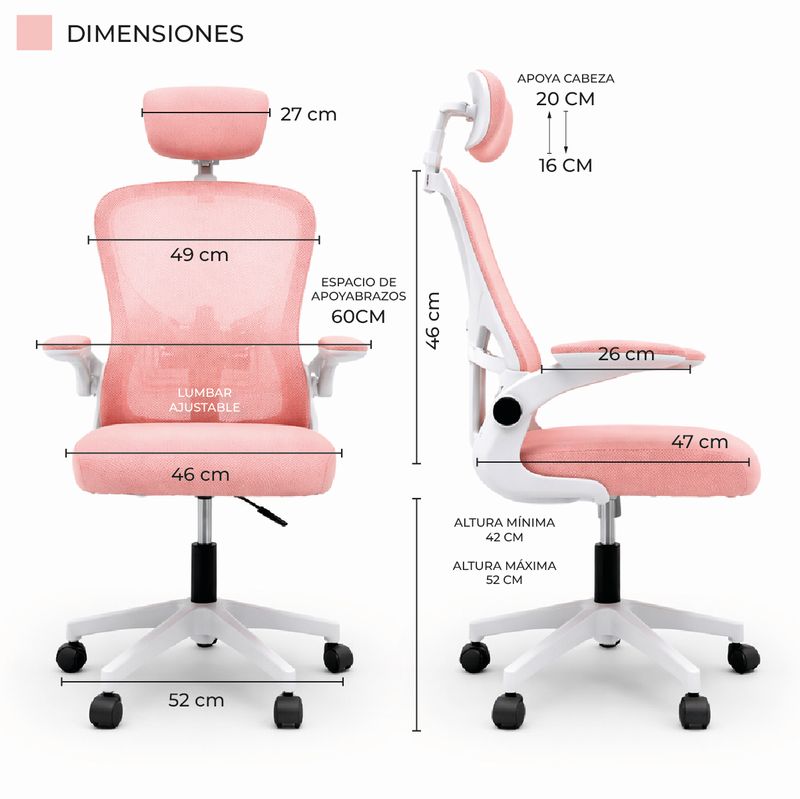 Dimensiones del asiento: Ancho de 52 cm, con una altura ajustable desde 45 cm hasta 55 cm del suelo, y una profundidad de 50 cm.