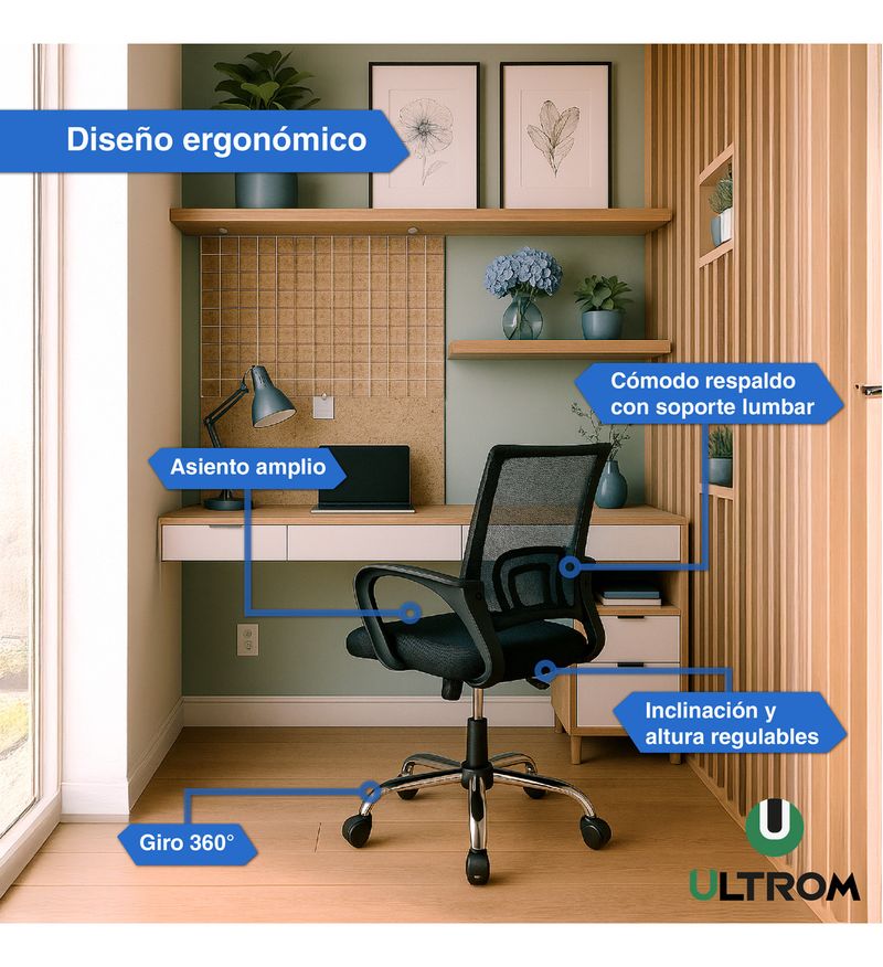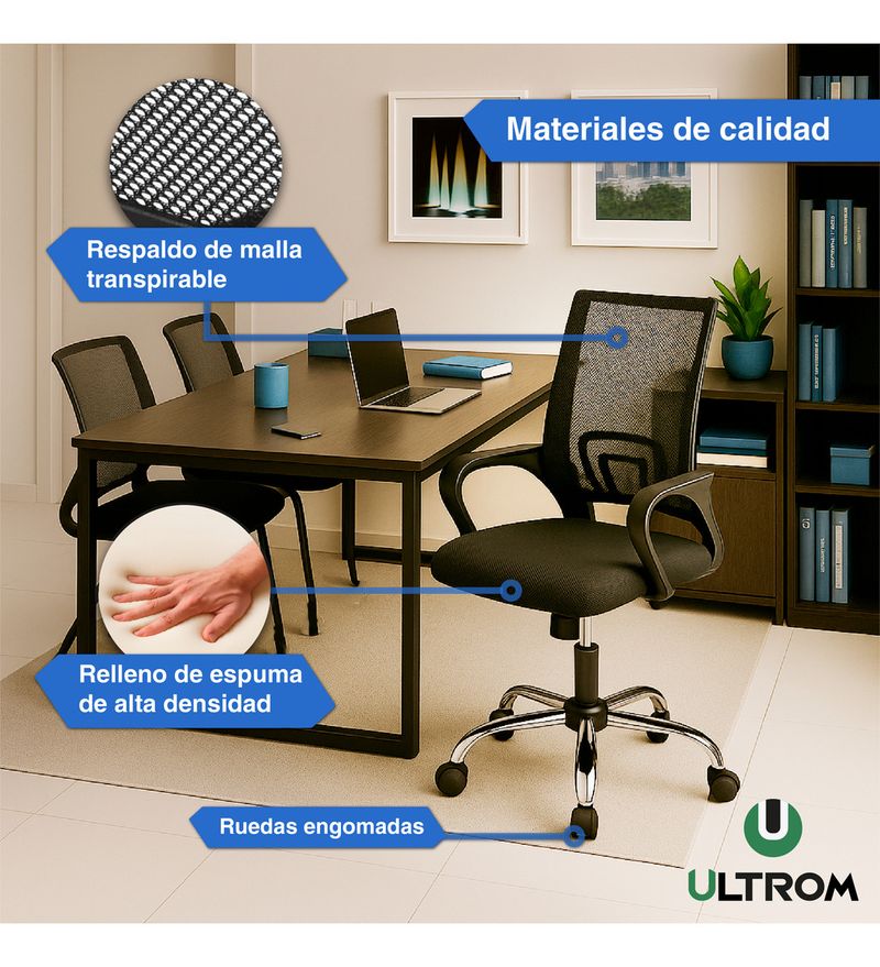 • Materiales: Base de metal, estructura de plástico, asiento de esponja, tela mesh y ruedas de PVC engomadas