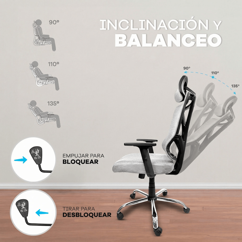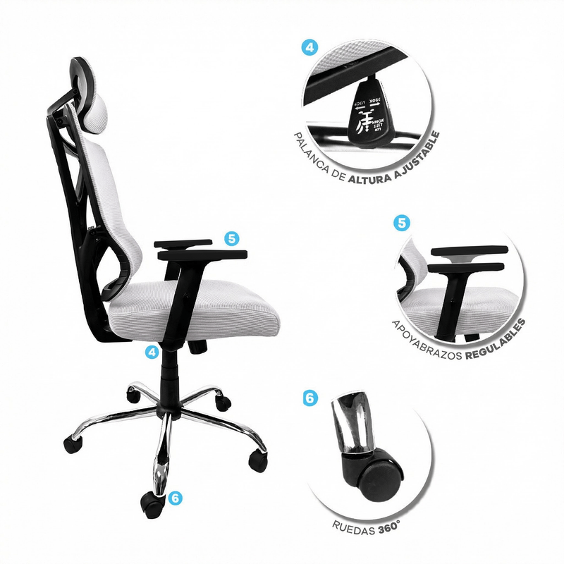 * Ruedas silenciosas y con giro de 360 grados para moverte ágilmente.
