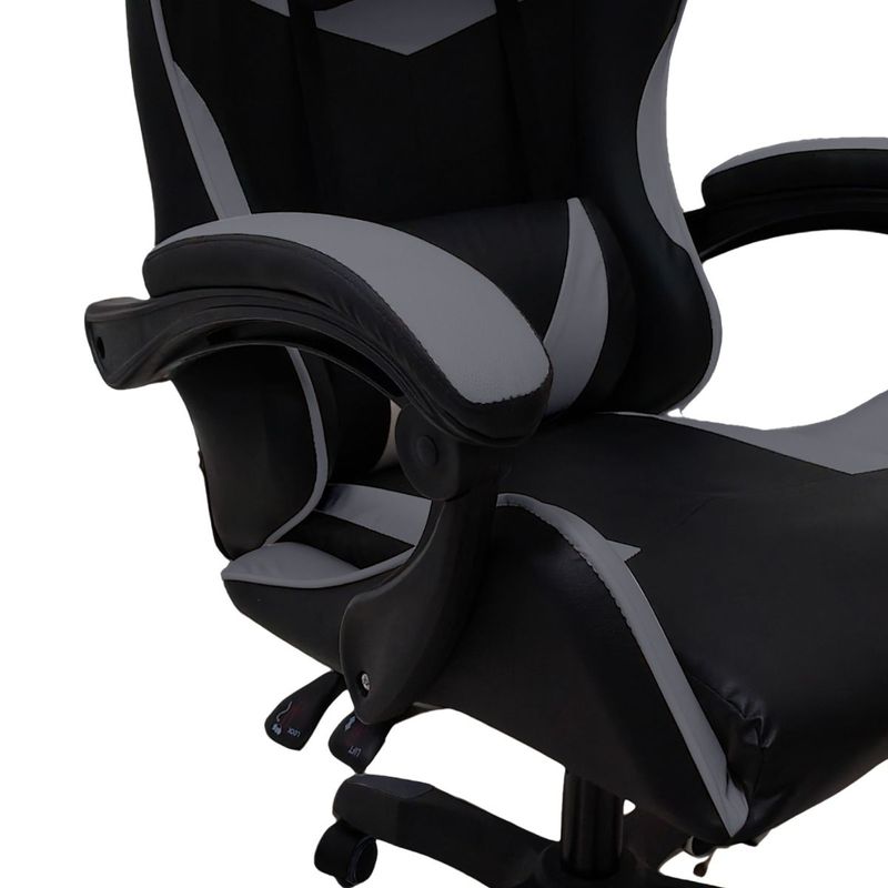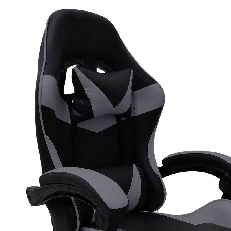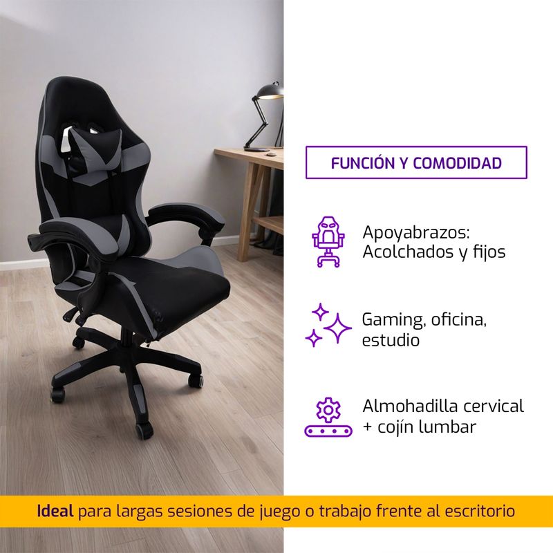 Silla Gamer ergonómica con diseño deportivo tipo butaca de competición, ideal para largas sesiones de juego o trabajo frente al escritorio. Tapizada en ecocuero de alta resistencia, incluye cojín lumbar y almohadilla para cabeza, brindando el máximo confort y soporte postural. Con base de 5 ruedas y asiento regulable en altura, combina estilo y comodidad en tu setup.