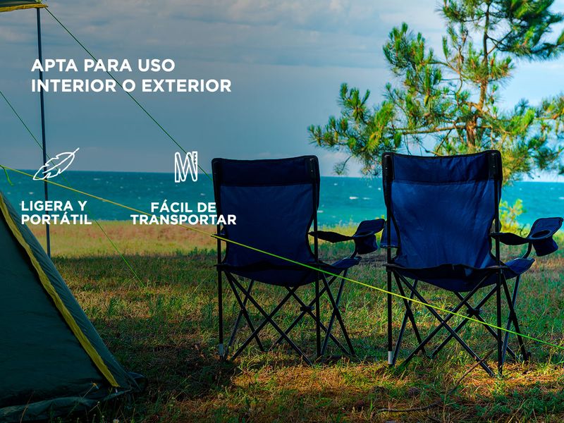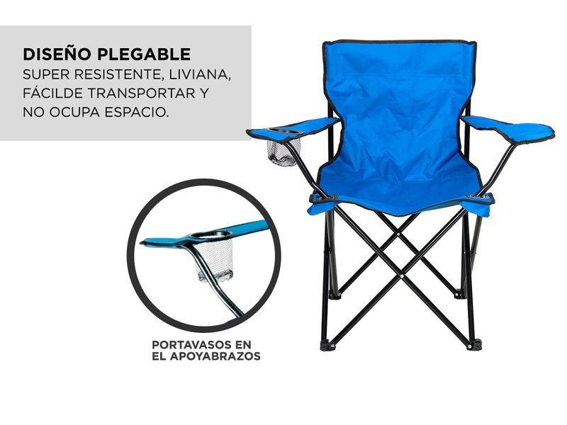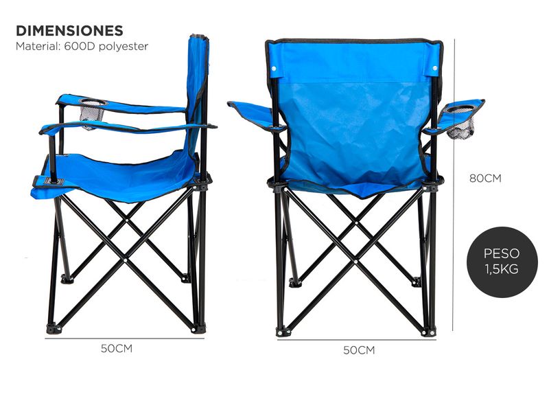 Ligero y fácil de usar, conveniente para el hogar o de viaje. ¡Se abre y se pliega en segundos! Tiene una estructura de acero resistente, tela de poliester durable, descansabrazos con espacio para una taza o bebida. Incluye bolsa de transporte con correa de hombre para cada una. Ideal para tu dia de campamento, vacaciones, etc.
