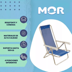 La silla reposera reclinable 4 posiciones Mor Sannet es perfecta para disfrutar de momentos de relax en la playa o en el camping. Su diseño plegable la hace fácil de transportar y guardar. Fabricada con materiales de alta calidad como lona y aluminio, garantiza resistencia y durabilidad. Con capacidad para soportar hasta 100 kg, es ideal para personas de diferentes tamaños y pesos. Su color Azul le brinda un aspecto elegante y moderno. Disfruta de la comodidad y versatilidad que ofrece esta reposera Mor Sannet en tus momentos al aire libre.