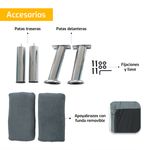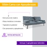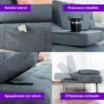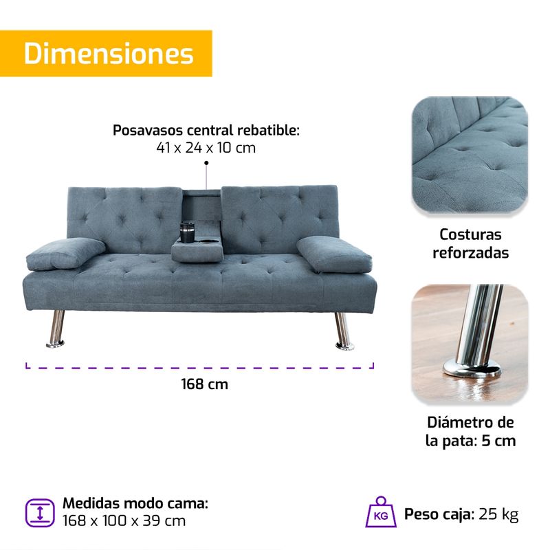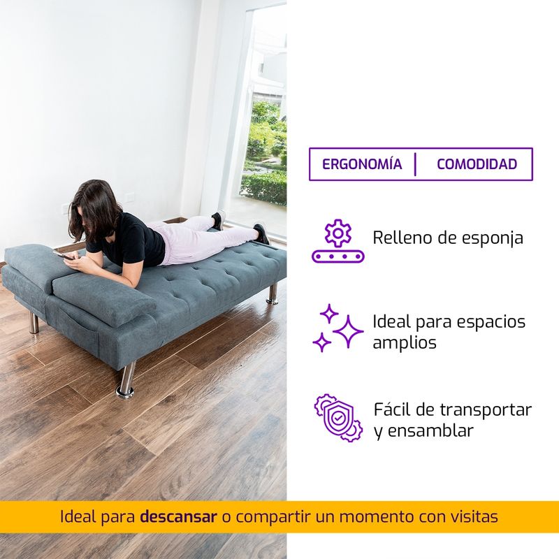 El futón cuenta con tres posiciones de reclinado, por lo que además de usarlo como sillón también se puede utilizar como cama. Sus patas están hechas en metal color cromo, posee costuras reforzadas, tapizado en poliéster y relleno de esponja.
