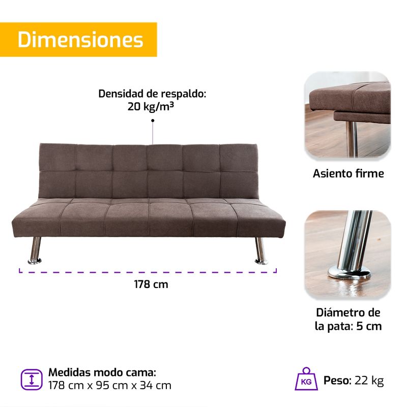 Modo sofá: 178 cm de ancho x 81 cm de alto x 76 cm de profundidad.