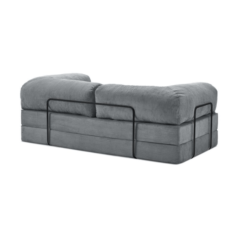 Este modelo combina diseño moderno, practicidad y confort en una sola pieza. Tapizado en pana gris plomo suave al tacto, su estilo lo transforma en el protagonista de cualquier sala de estar o living.