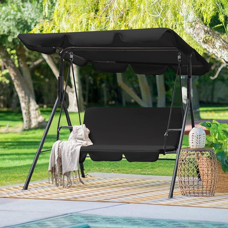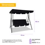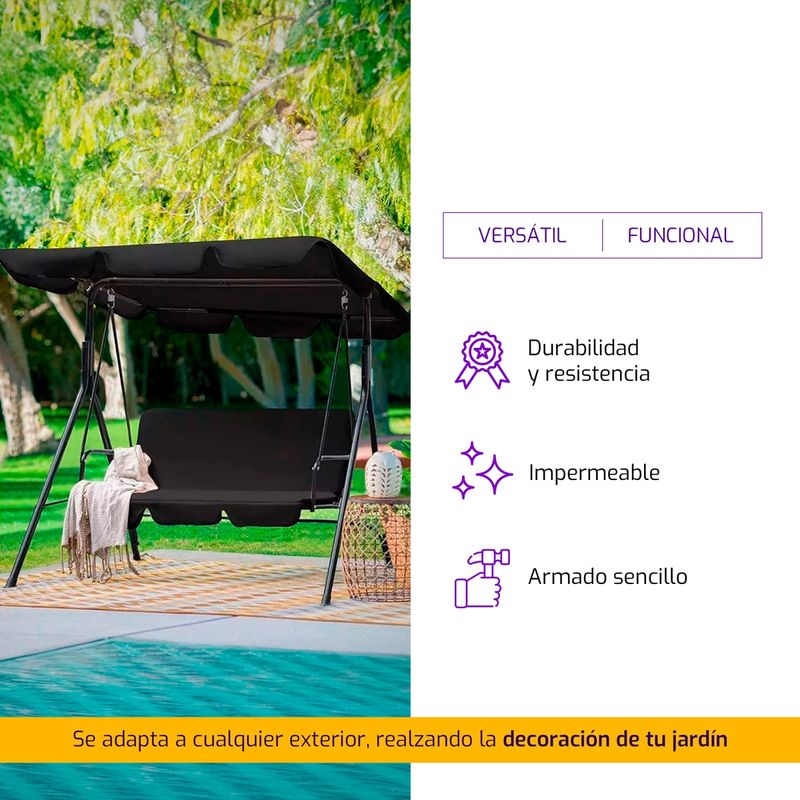 Estructura de acero resistente y tela de poliéster impermeable. Ideal para jardín, terraza o balcón. Fácil de armar y con capacidad para 3 personas. Disfruta de la comodidad y durabilidad en tu espacio exterior.