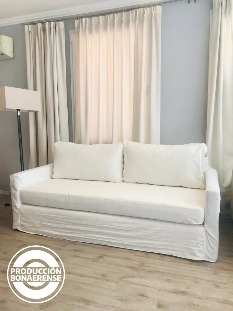 El sillón Ghost de 2 x 0,90 tiene la medida justa para espacios no demasiado grandes, te permite compartirlos con la comodidad perfecta, e incluso podés disfrutarlos como cama auxiliar de una plaza. Tiene una estructura reforzada de madera paraíso, está forrado con lienzo francés (raso rígido opaco), con funda de tusor Grafa 5 lavable, cuenta con una placa de alta densidad de 26 kilos para el asiento, y sus almohadones de respaldo son 100 % vellón siliconado.