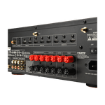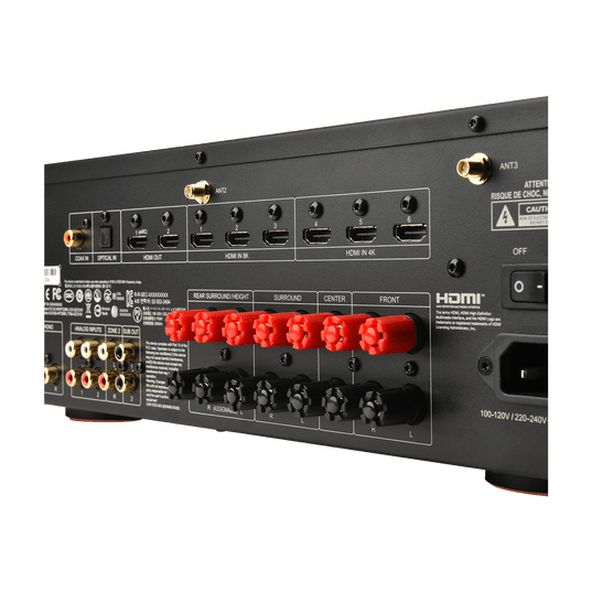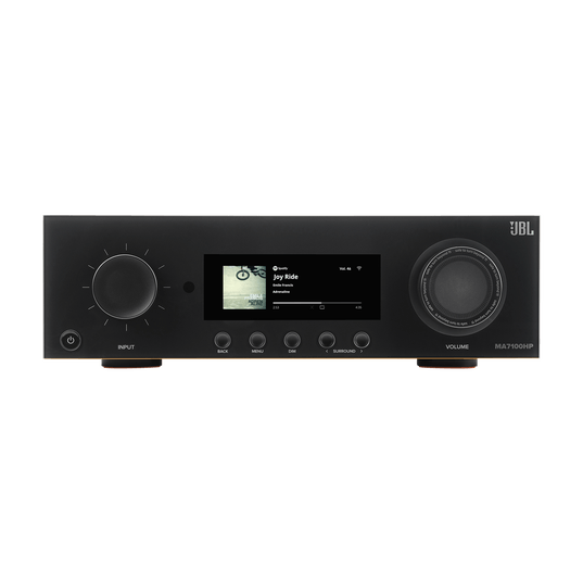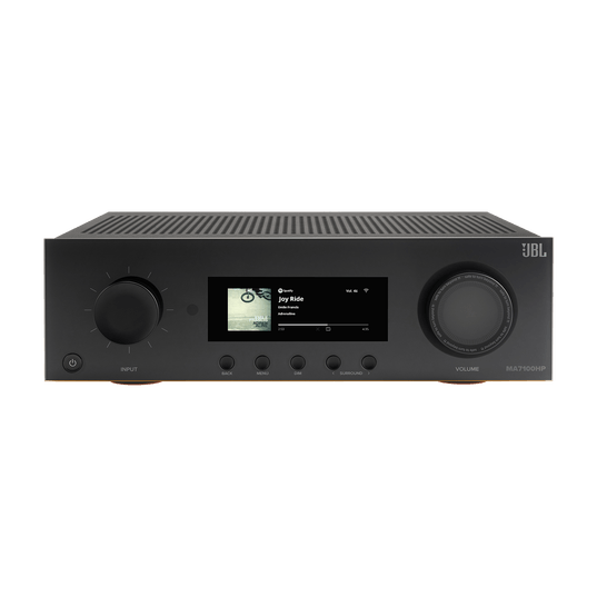 El JBL MA7100HP es un receptor AV de alto rendimiento de 7.2 canales que ofrece una experiencia de cine en casa con calidad profesional, compatible con video 8K/60Hz y 4K/120Hz gracias a sus 6 entradas HDMI y 2 salidas, incluyendo soporte eARC, lo que permite una integración perfecta con Smart TVs, proyectores, consolas de videojuegos y servicios de streaming. Su sistema de sonido envolvente admite configuraciones de hasta 7.1 o 5.1.2 canales, con decodificación nativa de Dolby Atmos y DTS:X, y amplificación de clase D de bajo ruido con potencia de 125W RMS a 8Ω y 175W RMS a 4Ω en cada uno de sus 7 canales, garantizando un rendimiento potente y real. Incluye conectividad inalámbrica vía Bluetooth AptX Adaptive, Apple AirPlay 2 y Google Chromecast, entrada de fono Moving Magnet para tocadiscos, ecualización automática EZ Set EQ, compatibilidad con Dirac Live (requiere licencia adicional) y control IP para integración con sistemas de automatización. Sus dimensiones son 135 x 432 x 396,4 mm y se entrega con todos los accesorios necesarios para su instalación.