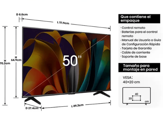 Sumergite en la calidad de imagen que solo un televisor 4K puede ofrecer. Con una resolución de 3840x2160 píxeles y una pantalla LED de 50 pulgadas, este modelo brinda imágenes nítidas, colores intensos y un brillo de 300 nits, ideales para disfrutar de contenido con gran nivel de detalle. Además, su frecuencia de refresco de 60Hz y tiempo de respuesta de 8 ms aseguran una visualización fluida, ideal para cine, series o videojuegos.