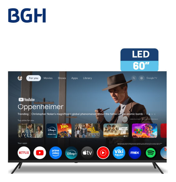 SMART TV Led BGH de 60. Modelo: B6026US6G GOOGLE TV. Pantalla: 60" LED 4K UHD (3840 x 2160 px). Panel: IPS (amplio ángulo de visión). Sistema Operativo: Google TV. Procesador: ARM Cortex-A55 Quad Core. Memoria. 2 GB RAM / 16 GB Almacenamiento. HDR: HDR10, HLG. Conectividad: 4 x HDMI 2.1 (con ARC), 2 x USB, Wi-Fi Dual Band, Bluetooth 5.1. Sonido: Dolby Audio / Dolby Atmos. Diseño: Cuenta con un diseño "frameless" (sin bordes visibles), lo que le da un aspecto muy moderno y limpio, ideal para un living minimalista como el que visualizamos antes. Gaming y Streaming: Gracias a sus puertos HDMI 2.1, es apto para mejorar la fluidez en consolas y dispositivos multimedia. Google TV: Al tener el sistema operativo de Google, la navegación es muy intuitiva y tienes acceso a la Play Store para bajar todas tus apps de streaming favoritas (Netflix, Disney+, YouTube, etc.). Funciones extras: Incluye PVR (para grabar contenido) y la función Timeshift (pausa en vivo). Dimensiones del producto: Ancho: 134,6 CM. Altura: 86,8 CM. Profundidad: 33,2 CM. Peso: 12,4 Kg. Alimentación: 220V - 50hz. Garantía: 12 Meses. Origen: Argentina.