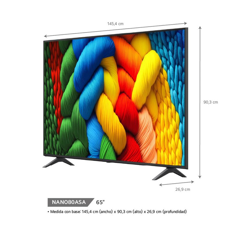 Disfrutá una experiencia visual superior con el LG Smart TV 65” Nano80 ASA UHD 4K NanoCell, diseñado para ofrecer colores más puros y realistas gracias a la tecnología NanoCell. Su resolución 4K UHD realza cada detalle, ideal para películas, deportes y gaming en pantalla grande, con una imagen clara desde cualquier ángulo.