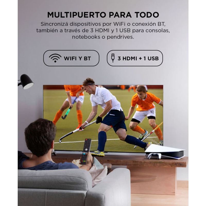 Incluye sistema operativo Google TV, lo que te permite acceder a apps populares (streaming, videos, música), navegador y servicios online sin necesidad de dispositivos adicionales. Tiene Wi-Fi, Bluetooth, múltiples puertos HDMI y USB para conectar consolas, soundbars, memorias, y más.
