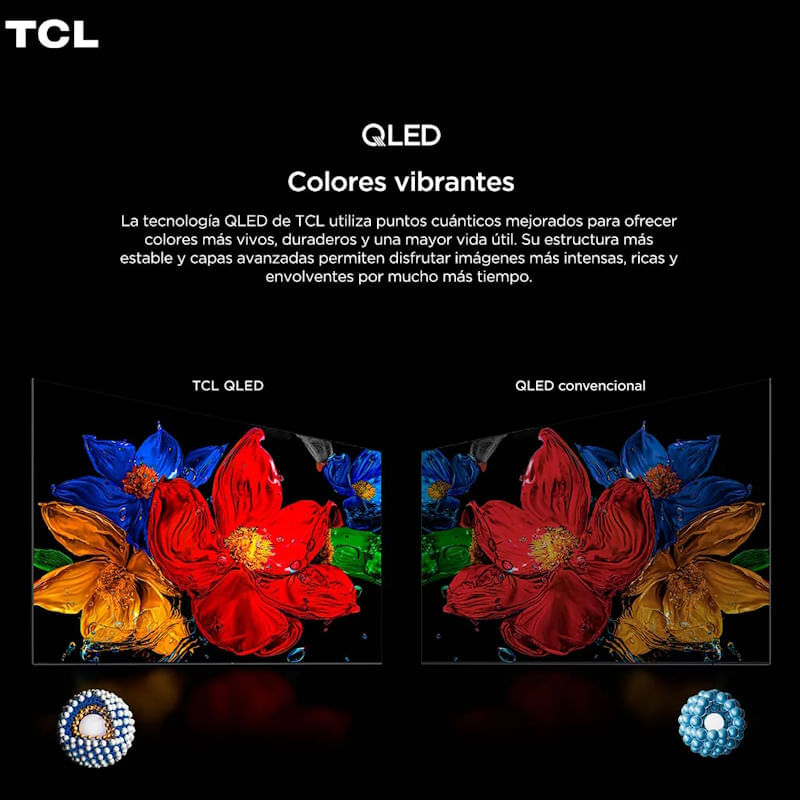 La tecnología TCL QLED utiliza Cristal Cuántico de Color mejorado con una estructura más estable, ofreciendo una vida útil prolongada y una imagen más rica, brillante y envolvente.