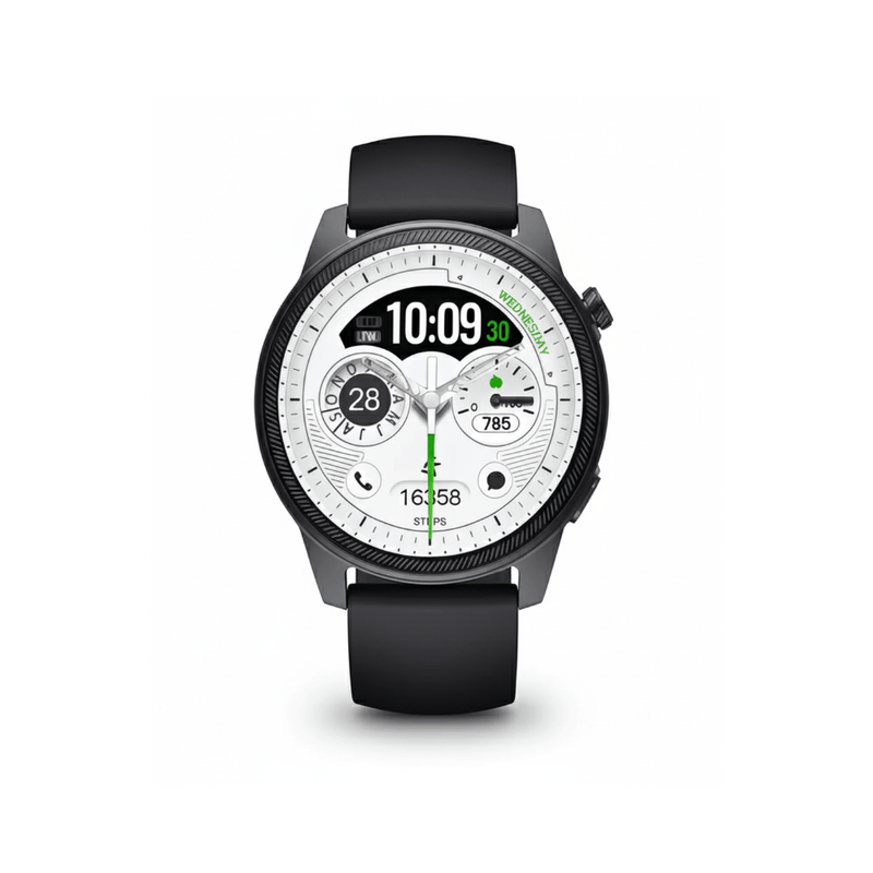 Diseño Elegante y Deportivo: Cuerpo negro con acabado metálico, pantalla curva y correa de silicona cómoda y resistente.