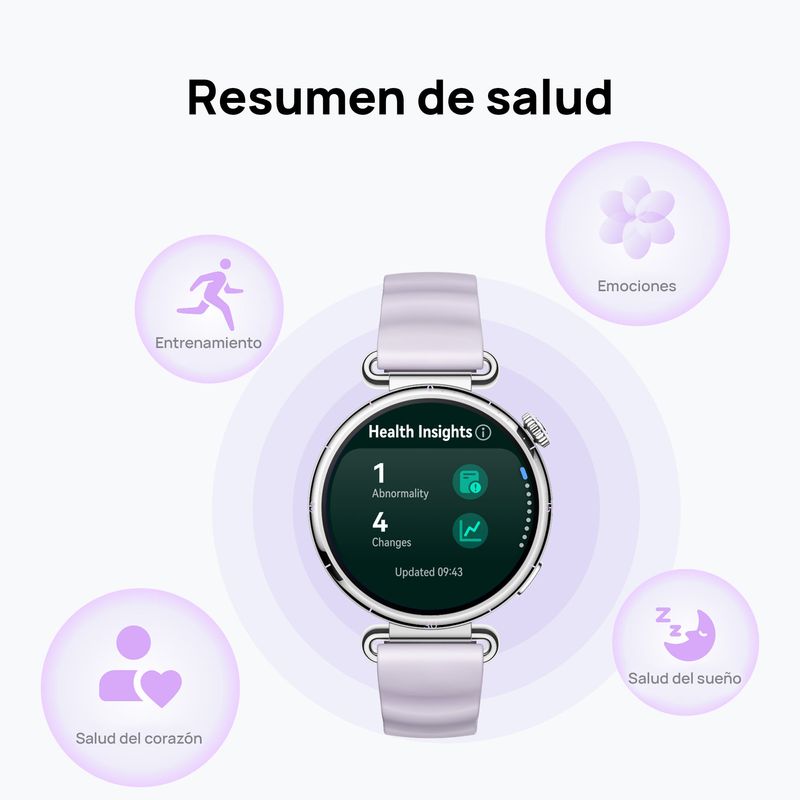 El Huawei Watch GT 6 (41 mm) combina elegancia y tecnología en un diseño compacto de 41,3 mm de diámetro y solo 9,99 mm de grosor. Su cuerpo está fabricado en acero inoxidable con un bisel metálico resistente y una trasera de polímero de alta calidad, disponible en atractivos colores como púrpura, blanco, dorado, negro y marrón. La correa de 18 mm se adapta cómodamente a muñecas de 120 a 190 mm, ofreciendo un ajuste versátil para el uso diario.
