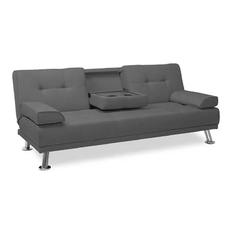 Apoyabrazos desmontables con velcro y adaptables como almohadas al desplegar el futón. El velcro cuenta con una solapa de tela o ecocuero para que el primero no quede expuesto una vez removidos los apoyabrazos.