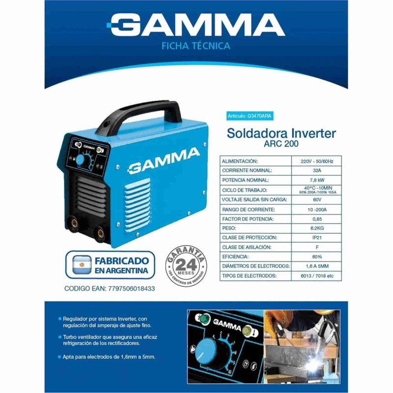 Regulador por sistema inverter, con regulación del amperaje de ajuste fino. Turbo ventilador que asegura una eficaz refrigeración de los rectifiadores. Provista con correa de transporte, cables y pinza por electrodo. Apta para electrodos de 1,6 a 5 mm.