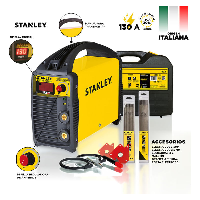 Soldadora Inverter Stanley Italiana Sirio 140. Construida con materiales livianos de alta resistencia y durabilidad.