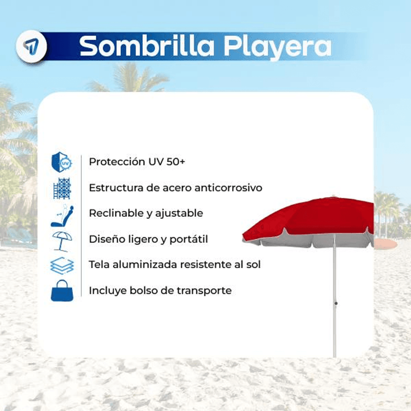 Sombrilla playera reclinable con protección UV 50+ diseñada para ofrecer protección, practicidad y estilo, ideal para la playa, el jardín o cualquier actividad al aire libre. Cuenta con lona aluminizada que bloquea eficazmente los rayos solares, estructura robusta de acero anticorrosivo y varillas reforzadas para mayor resistencia. Es ligera, plegable y fácil de transportar con su bolso incluido. Su diseño reclinable permite ajustar la inclinación para mayor comodidad, además de incluir un deflector integrado que la hace resistente al viento. Protección UV 50+, diámetro abierto de 165 cm, material de poliéster aluminizado, estructura de acero anticorrosivo, diámetro del caño principal de 3 cm, peso de 1.95 kg, sistema de inclinación, largo cerrado de 110 cm x 9 cm y varillas reforzadas de 4 mm. Incluye bolso de transporte resistente y compacto con sistema de ajuste de rosca para mayor seguridad. Perfecta para disfrutar del aire libre con comodidad y protección.