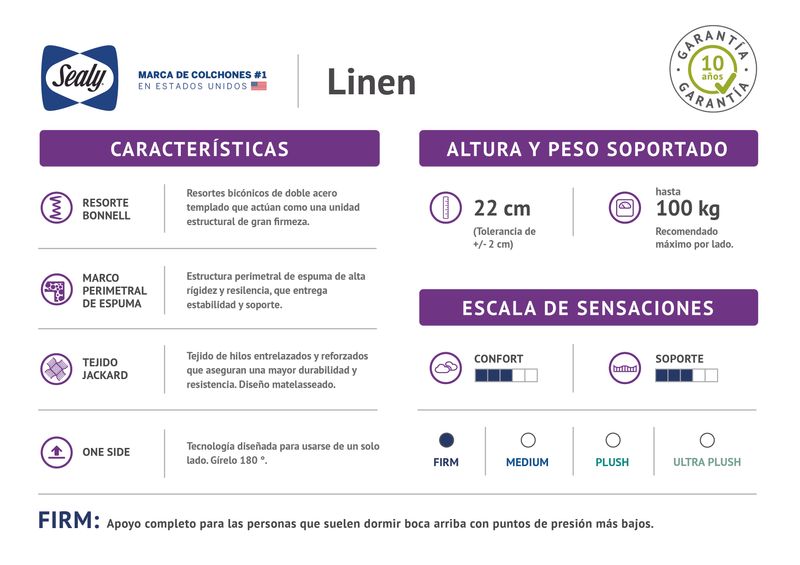 El colchón Sealy Linen posee resortes Bonnell, elaborados en acero doble templado que otorgan gran resistencia y durabilidad.