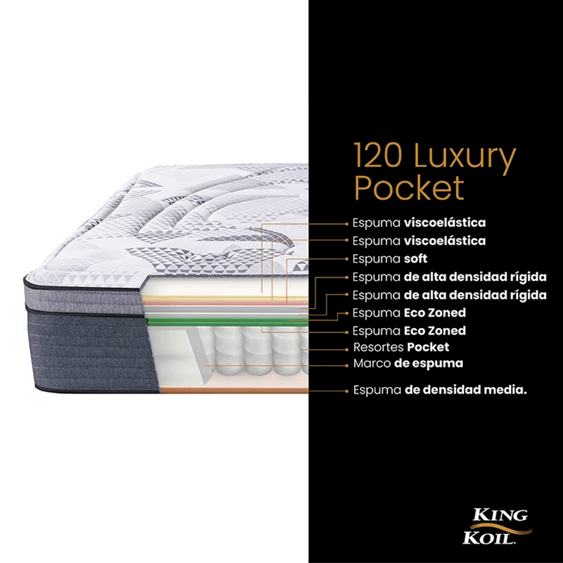 sommier y colchón King Koil Luxury Pocket ofrece una experiencia de descanso firme, cómoda y sustentable. Su estructura combina resortes Pocket Coil con espumas viscoelásticas y Eco Zoned. De este modo, logra una superficie adaptable que se ajusta al cuerpo sin perder estabilidad. Además, cuenta con un europillow cubierto con tejido de punto elaborado con materiales reciclados del océano.