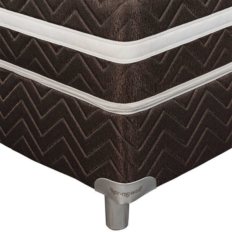 El conjunto Springwall One Plus, posee una base de madera estacionada con tapizado de borde Jackard Gris, todo matelaseado y patas de madera tipo Colonial de 12 cm.