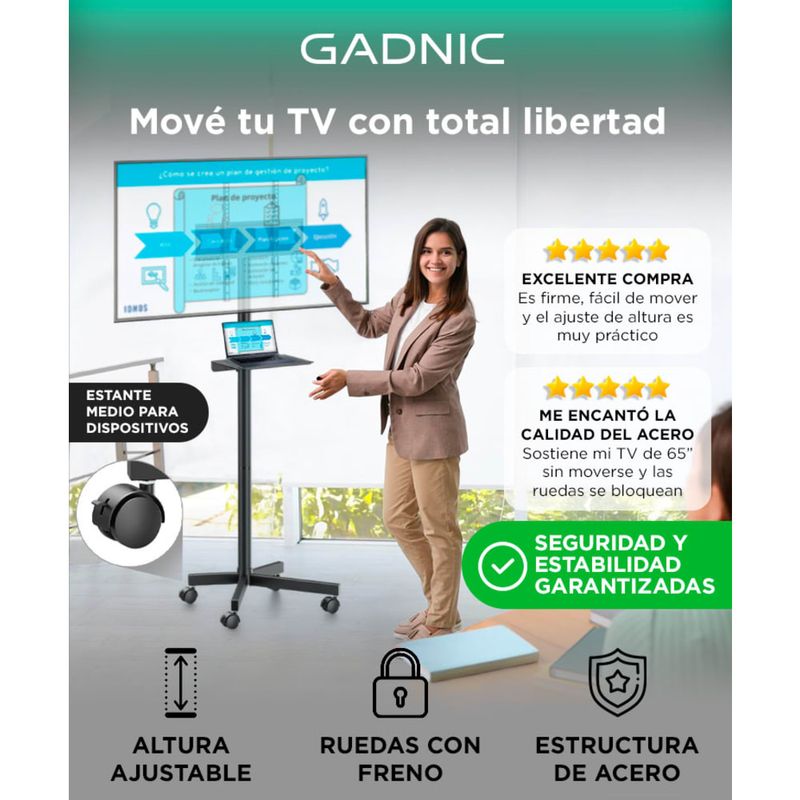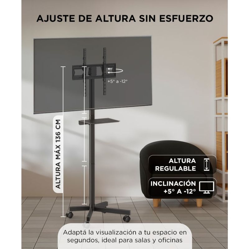 Desplazá tu televisor fácilmente y fijalo donde quieras. Las ruedas bloqueables brindan estabilidad y control absoluto.