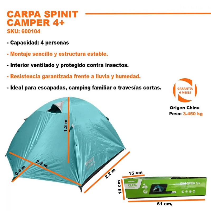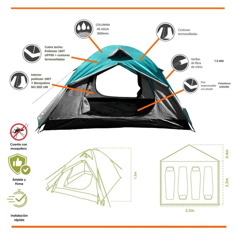 Además, su piso de polietileno con zócalo alto aumenta la durabilidad y evita filtraciones, garantizando una experiencia de camping más cómoda y segura. Ligera y práctica, es una opción confiable para quienes buscan una carpa espaciosa, fácil de armar y resistente al clima.