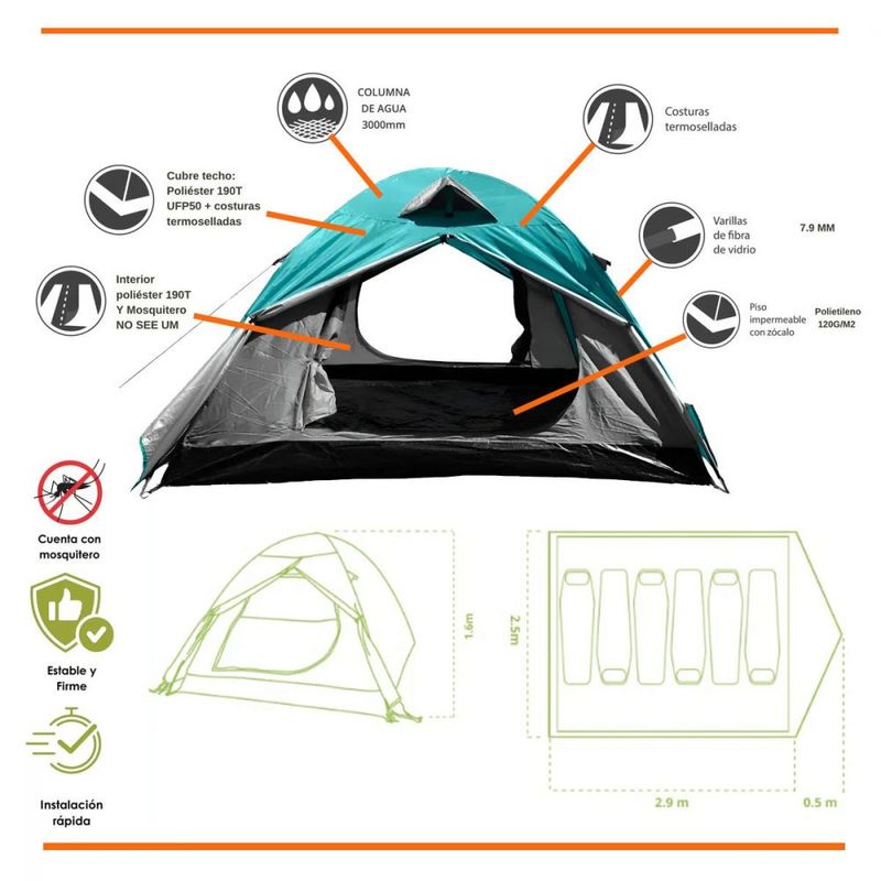 Además, su piso de polietileno con zócalo alto aumenta la durabilidad y evita filtraciones, garantizando una experiencia de camping más cómoda y segura. Ligera y práctica, es una opción confiable para quienes buscan una carpa espaciosa, fácil de armar y resistente al clima.