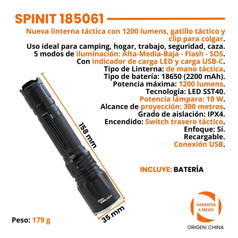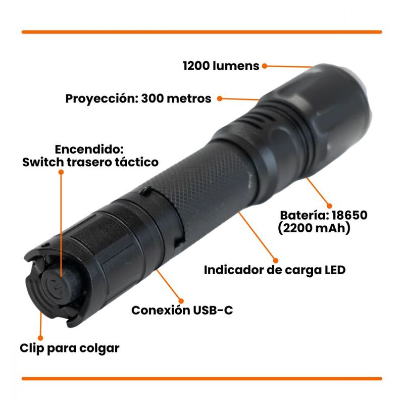 Nueva linterna táctica con 1200 lumens, gatillo táctico y clip para colgar.