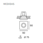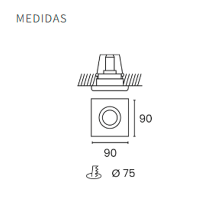 - Medidas: 90 x 90 mm, con un diámetro del hueco de 75 mm, ideal para embutir en techos.