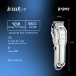La cortadora de pelo B-WAY Steel Clip ofrece potencia y autonomía para realizar cortes uniformes en todo tipo de cabello. Su funcionamiento inalámbrico brinda mayor comodidad y libertad de movimiento durante el trabajo, permitiendo un manejo ágil y eficiente. Incorpora batería de alto rendimiento con hasta 240 minutos de uso continuo y un tiempo de carga aproximado de 4 horas. Incluye seis peines guía que permiten trabajar diferentes largos de corte, desde medidas cortas hasta largos mayores, lo que la convierte en una herramienta versátil para cortes completos, rebajes y mantenimiento. El equipo se complementa con aceite lubricante, cepillo de limpieza, protector de cuchillas y cable de carga USB.