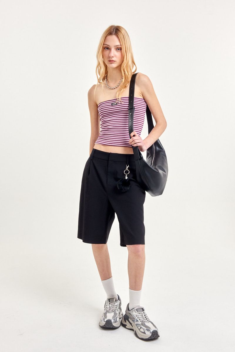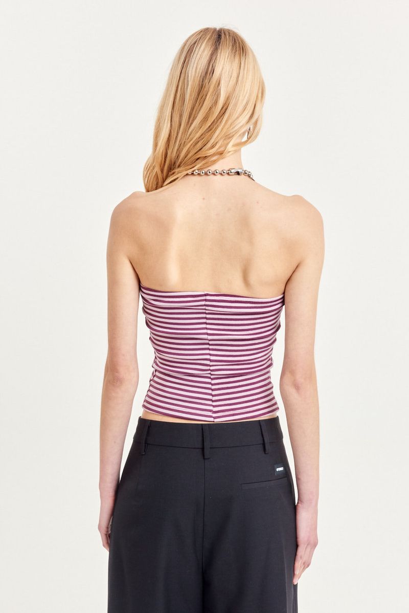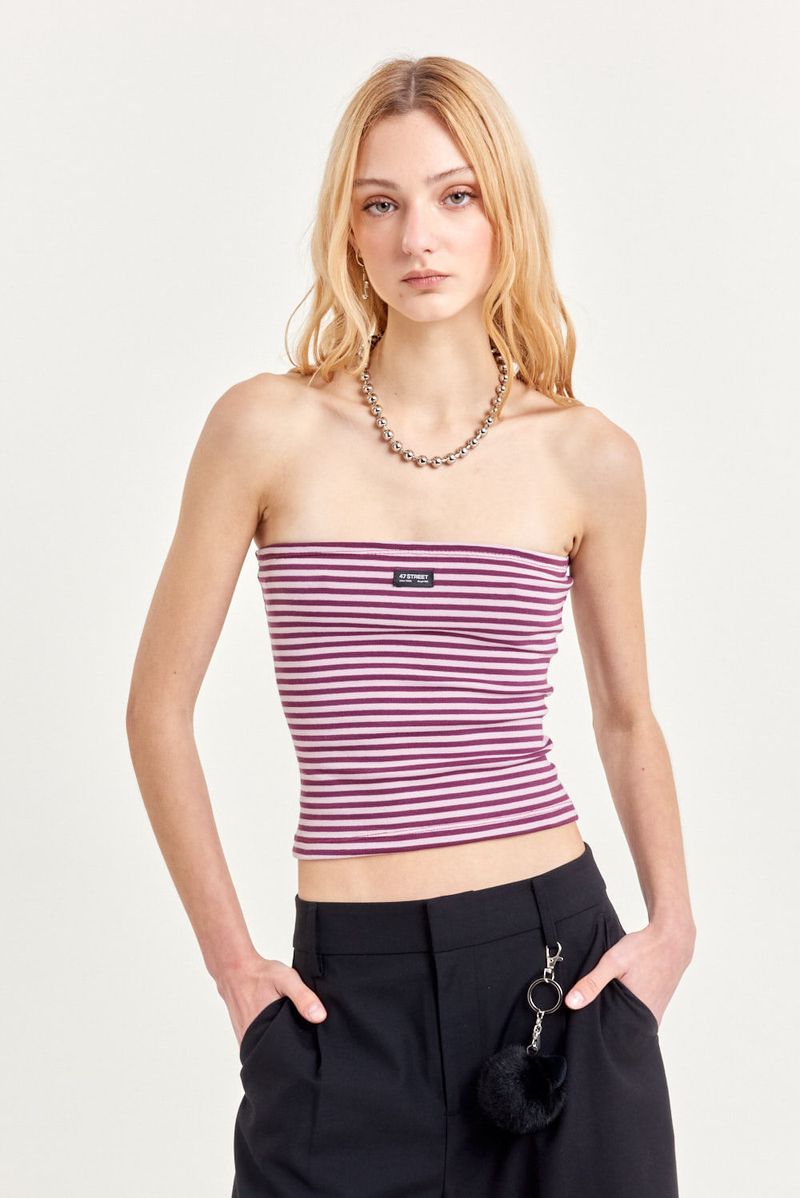 Top strapless de ribb rayado con calce al cuerpo y largo hasta la cadera. Lleva etiqueta tejida en el frente. Su tejido elastizado aporta confort y adaptabilidad.