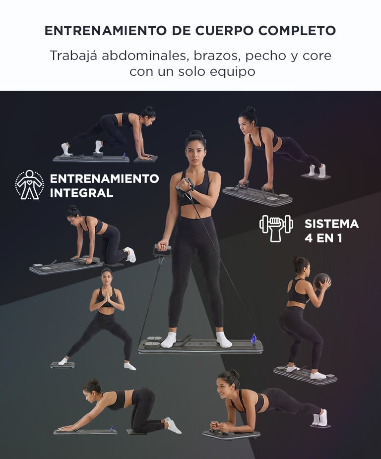 Funciones: Ab wheel, bandas de resistencia, push-ups, plank