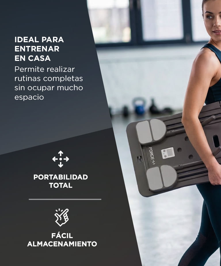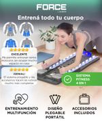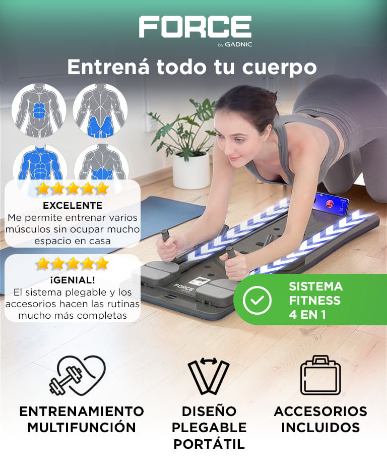 La tabla de pilates portátil Force by Gadnic permite realizar diferentes ejercicios en un solo equipo. Su sistema 4 en 1 permite trabajar abdominales, pecho, brazos y core con rutinas funcionales.