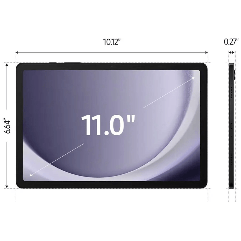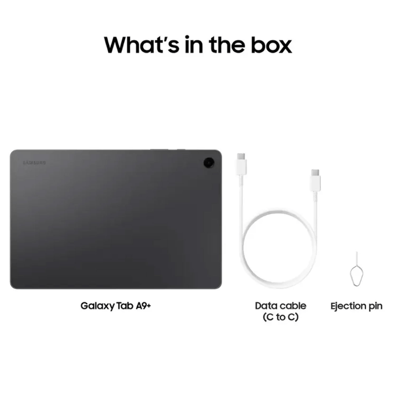 La Tab A9+ se destaca por su diseño fino en acabado Graphite, cuerpo metálico y peso liviano. Es compatible con funciones multitarea avanzadas y cuenta con el entorno seguro Samsung Kids, ideal para uso familiar.