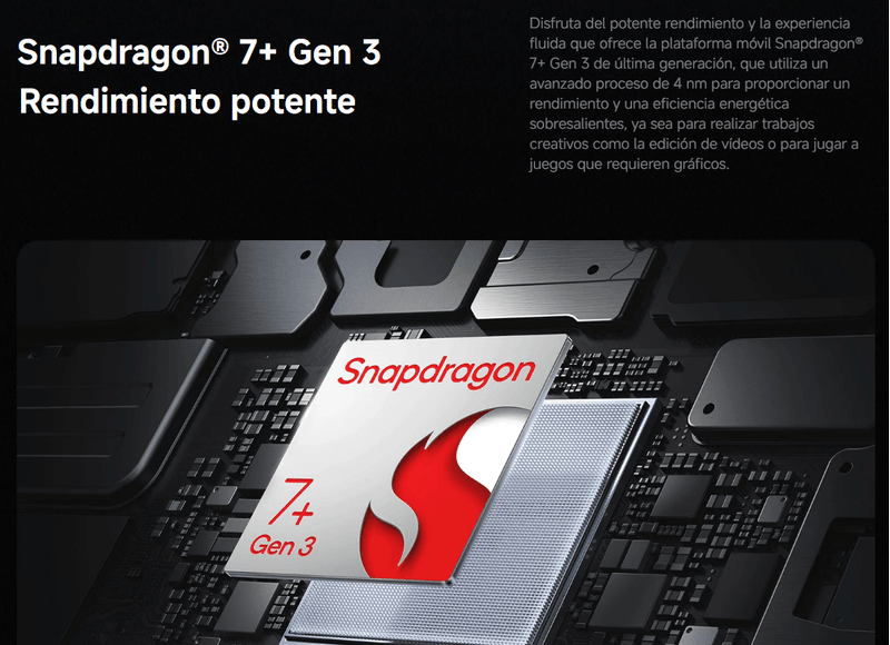 Snapdragon 7+ Gen 3 Mobile Platform4nm proceso de fabricaciónOcta-core, hasta 2.8GHzAdreno GPUQualcomm AI motor