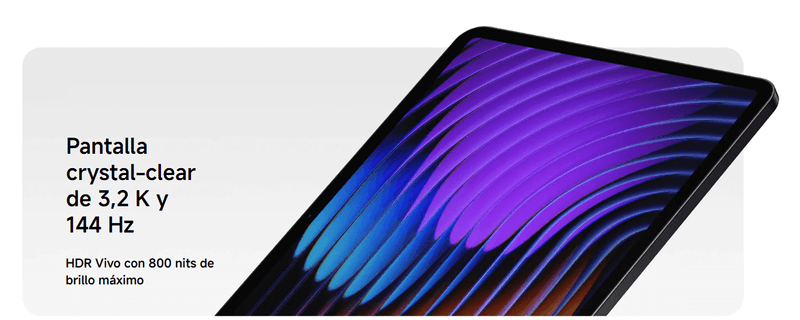 Pantalla cristalina de 3.2K 144Hz 11.2 "3: 23200 x 2136, 345 ppiUp hasta 144HzHasta 360Hz 240Hz (con pluma) 800 nits brillo máximo TÜV Rheinland Low Blue Light (solución de hardware) TÜV Rheinland Flicker Free - TÜV Rheinland Flicker Free - TÜV V Renania Circadian FriendlyOriginal color PRO | Modo de luz solar | 68 mil millones de colores | DCI-P3 | Pro HDR | Modo de lectura | Colores adaptativos | Motor de imagen AI | HDR10 | Dolby Vision | Tecnología Wet Touch | 10x superresolución* El tamaño de la pantalla de Xiaomi Pad 7 es de aproximadamente 11.2 pulgadas en el rectángulo completo cuando se mide el diagrama onalmente. El área visible real es menor debido al diseño de esquina curva y las medidas entre productos individuales pueden variar.