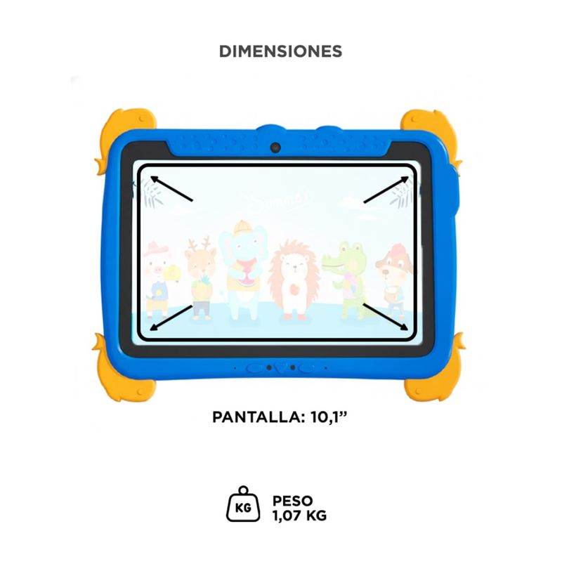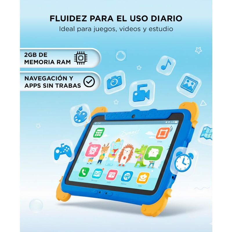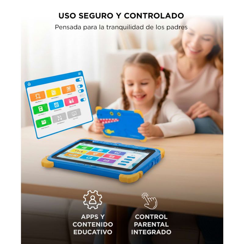 Su funda protectora integrada ayuda a proteger la tablet frente a golpes y caídas leves propias del uso diario. El diseño resistente y amigable está pensado para manos pequeñas, favoreciendo un uso más seguro y duradero en el tiempo.
