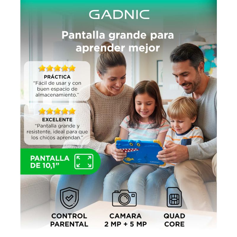 La Tablet Gadnic incorpora una pantalla de 10,1 pulgadas que facilita la visualización de contenidos educativos, videos y juegos. Su tamaño permite una experiencia más confortable para estudiar y entretenerse, reduciendo la fatiga visual durante sesiones de uso prolongadas.